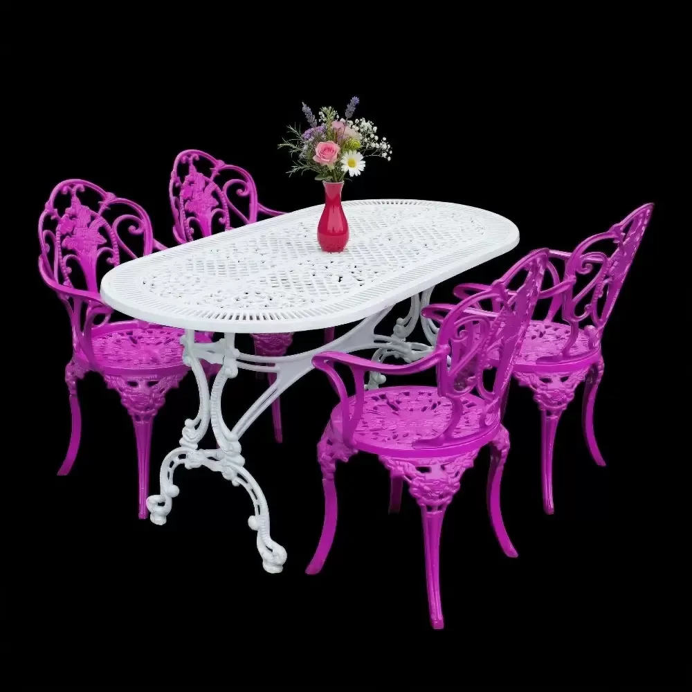 Elektrostatik toz boya teknolojisi ile fırınlanarak renklendirilen takımımız; güneşin UV ışınlarına, yoğun neme ve yağışlara karşı tam dirençlidir. Demir ferforje ürünlerin aksine alüminyum gövde asla oksitlenme ve çürüme yapmaz.