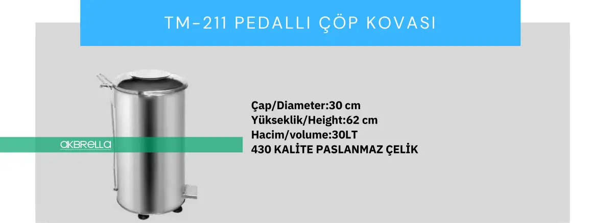 Akbrella markasının özenle tasarladığı TRS 211 kapaklı pedallı çöp kovası, iç ve dış mekanlarda hijyen ve pratiklik arayanlar için ideal bir çözümdür. Orta boy, yuvarlak silindir tasarımıyla her ortama kolayca uyum sağlayan bu çöp kovası, paslanmaz metal malzemesi sayesinde uzun ömürlü ve dayanıklıdır.