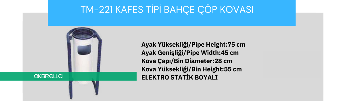 Akbrella TRS 221 Küllüklü Park Tipi Çöp Kovası ile dış mekanlarınızda temizlik ve düzeni sağlayın, misafirlerinize ve kullanıcılarınıza hijyenik bir ortam sunun.