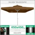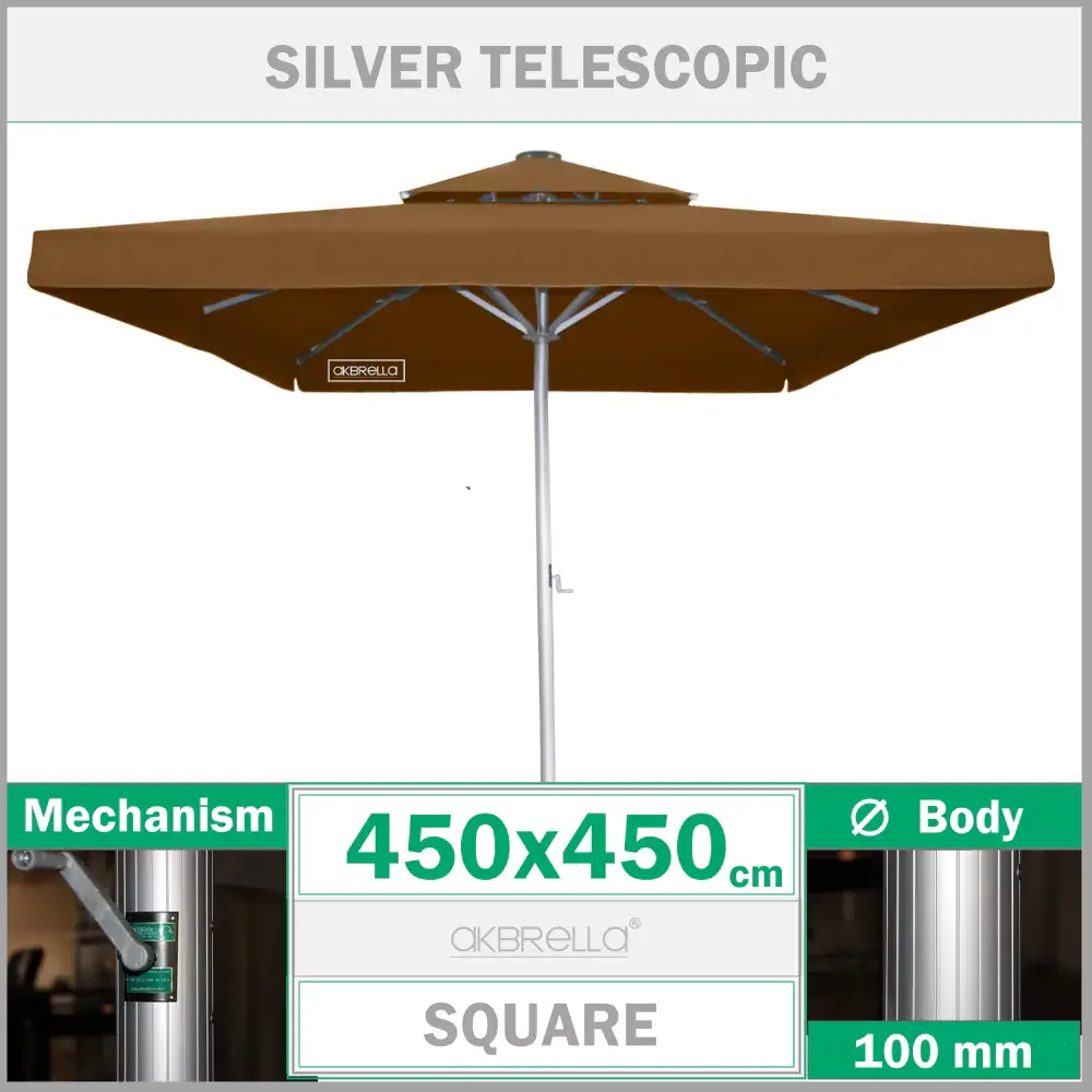 Cafe garden umbrella with ground color 450x450 cm square 100 mm thick silver aluminum body, telescopic system is produced from acrylic fabric. Thanks to its thick body and marble weighted legs or legs that can be fixed to the ground, it provides durable use in windy environments.