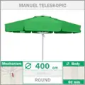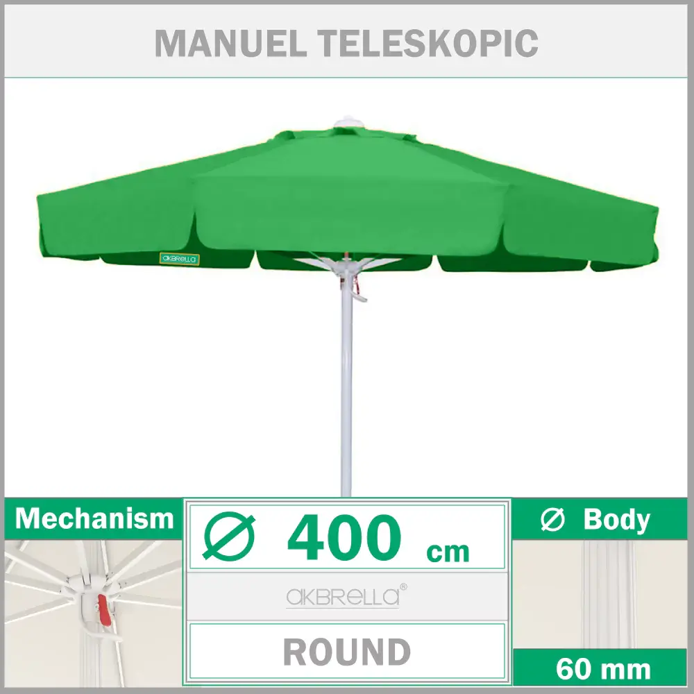 400 cm diameter round model with skirt latch system Manual telescopic acrylic fabric terrace umbrella with 60 mm aluminum body can be used safely in windy outdoor areas in pools and balconies thanks to its thick body. The telescopic system cafe garden umbrella, which can be added to the remote controlled heater, provides ease of use with its easy opening and closing. Wheeled or fixed foot options can be preferred. Logo printing can be applied on the fabric.