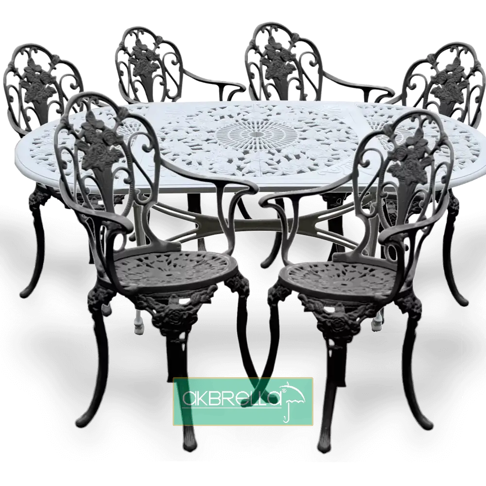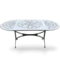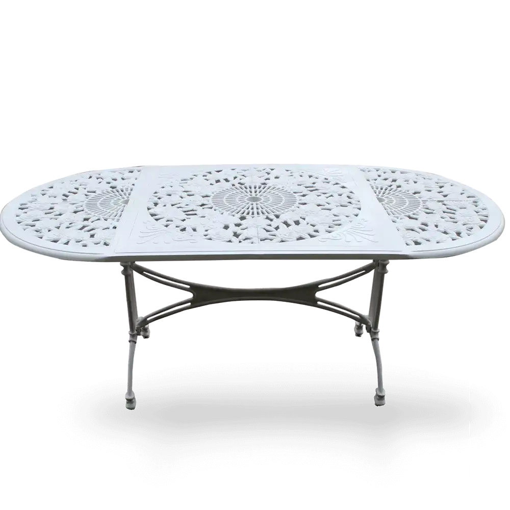 62x124 cm Ellipse white aluminum die-casting table with rose pattern is also available in 90x180 cm size. It is colored with electrostatic baking paint, which is resistant to outdoor weather conditions and water.