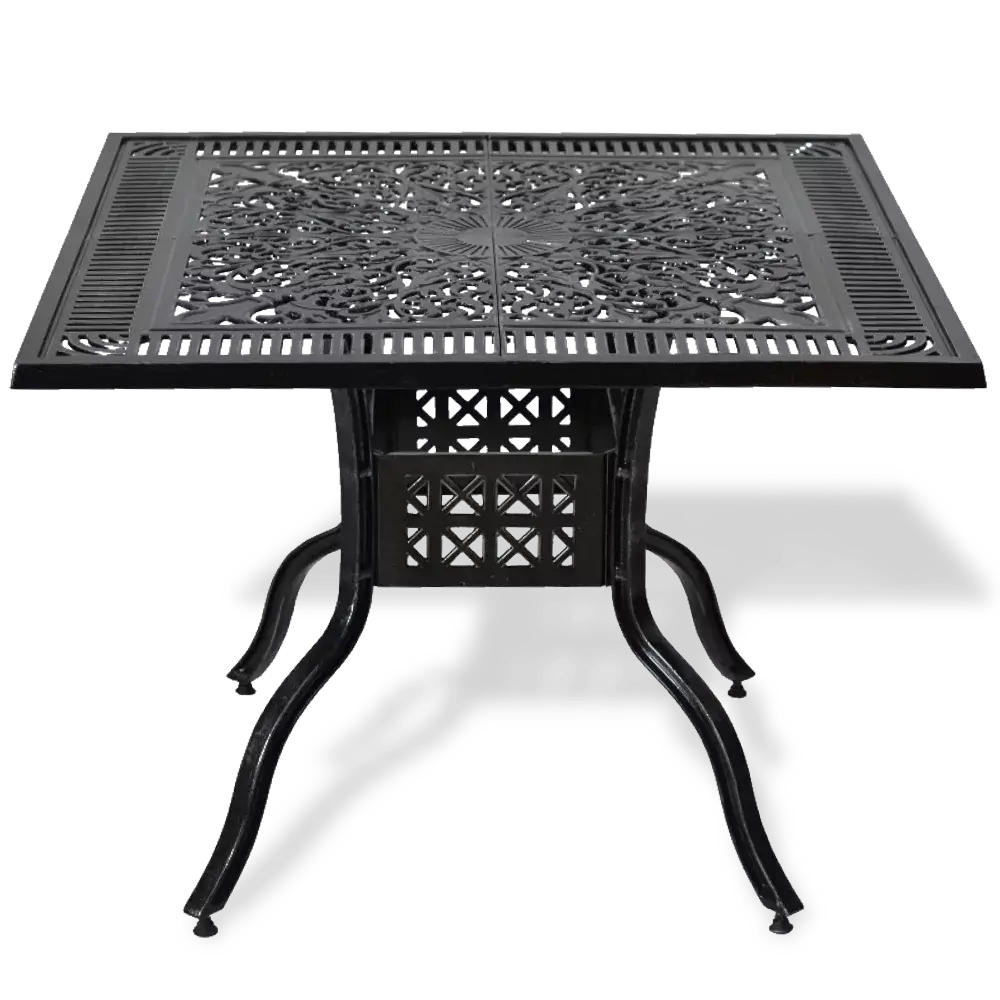 90x90 cm Decorative aluminum die-casting with lace motifs, Hittite foot model of the black square table is limited to our stocks and different foot options are also available. 90 cm transparent or smoked round rodaged and tempered glass can be placed on the table tinted with electrostatic powder coating. you can contact our customer representatives on our Whatsapp line to purchase the aluminum casting balcony set with a 2-year usage warranty.