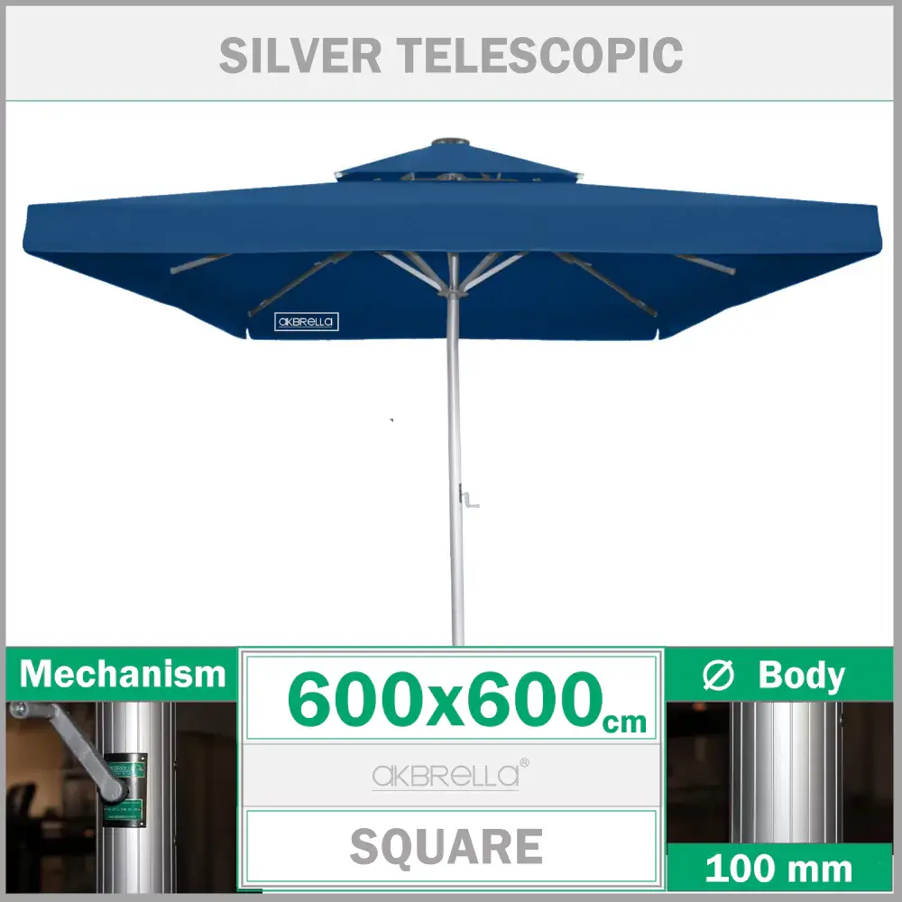 The 320 g/m2 acrylic fabrics we use in our Akbrella branded Silver telescopic system umbrellas are imported from Spain and are guaranteed to be color-fadeless and mildew-free for up to 10 years. Garden umbrellas with 600x600cm square 100mm thick aluminum body with Silver anodized coating, which you can choose in restaurants, cafes and terraces, are wind resistant umbrellas and can be produced by applying the logo print of your company in the colors and sizes you want.