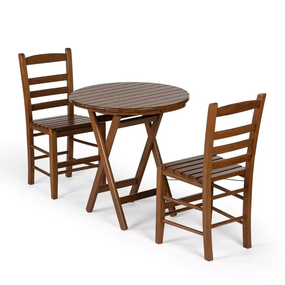 El Juego Doble modelo KLE 05 consta de 2 sillas de madera Rino y 1 mesa de madera plegable modelo KLE Buzludja de 60 cm de diámetro. Puede elegir el color nogal o blanco de la silla y la mesa de madera, que están hechas de madera de carpe horneada. La mesa redonda de jardín de madera también está disponible en tamaños de 70 cm de diámetro y 90 cm de diámetro. El vidrio templado y pulido en colores transparentes y ahumados se puede utilizar para un uso más elegante y duradero en la mesa.