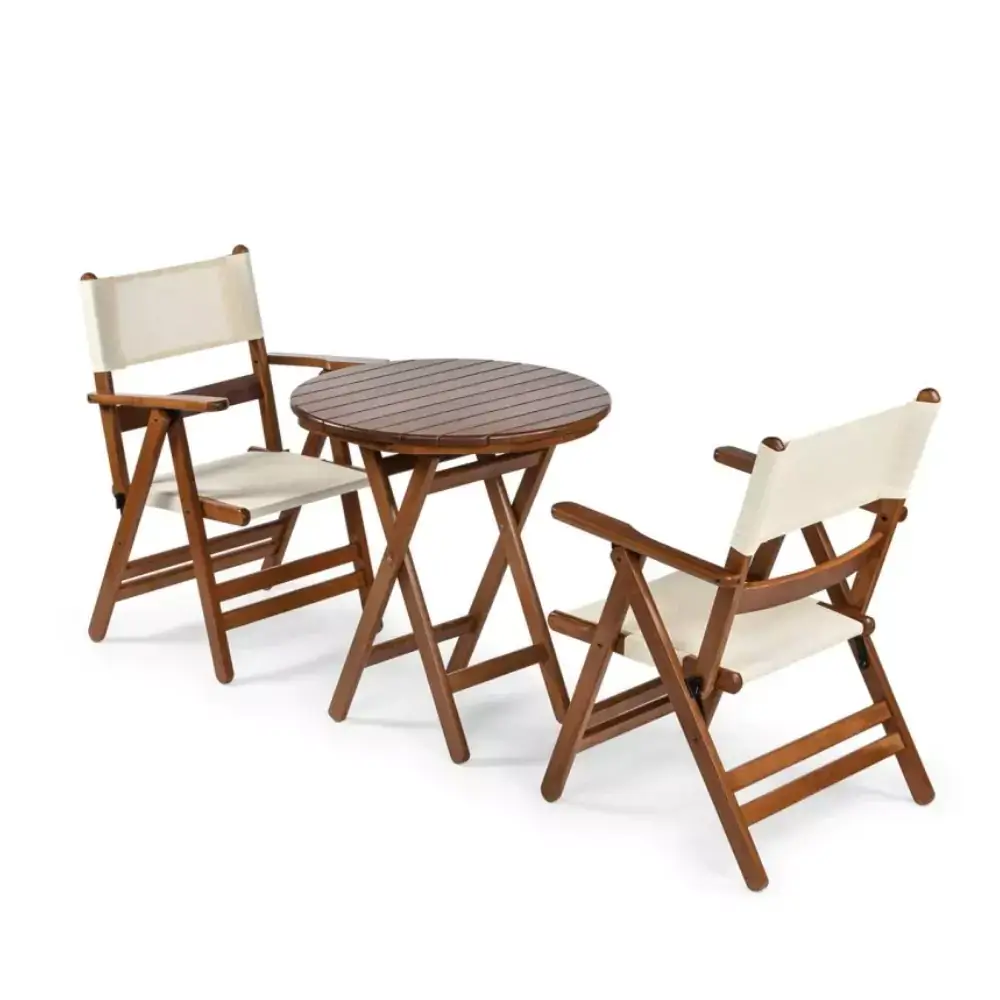 El juego de balcón de PVC KLE Buzludja Athens está creado con 2 sillas plegables de PVC Athens de 89x64x56 cm y 1 mesa redonda de madera plegable modelo KLE Buzludja de 70 cm de diámetro. La tela de las sillas de PVC Athens es de PVC italiano de color crema de serie, y es una tela repelente al agua que se puede lavar fácilmente. Madera de mesas y sillas 1.la clase está hecha de madera de carpe horneada. es un material duradero. Adecuado para uso en jardín, balcón, terraza.