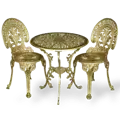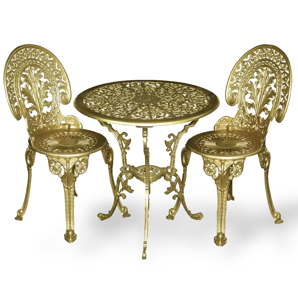 Modèle victorien vintage KSG TK - 16 Vous pouvez créer un merveilleux coin café dans vos maisons avec 2 chaises de jardin sans accoudoirs en fonte d'aluminium dorée et un ensemble de table ronde en fonte d'aluminium de 64 cm de diamètre. Si vous le souhaitez, vous pouvez choisir des coussins sur les chaises et du verre trempé et rodé sur la table. Vous pouvez contacter nos représentants clients sur notre ligne Whatsapp pour acheter l'ensemble de chaises de table en fonte de modèle victorien vintage que nous produisons pour ceux qui aiment le spectacle et la splendeur.