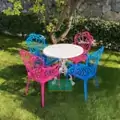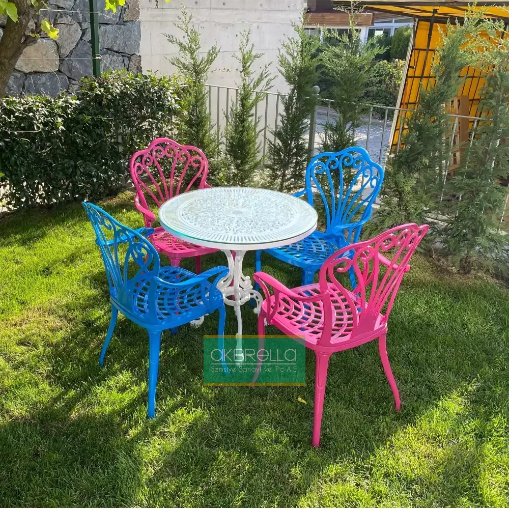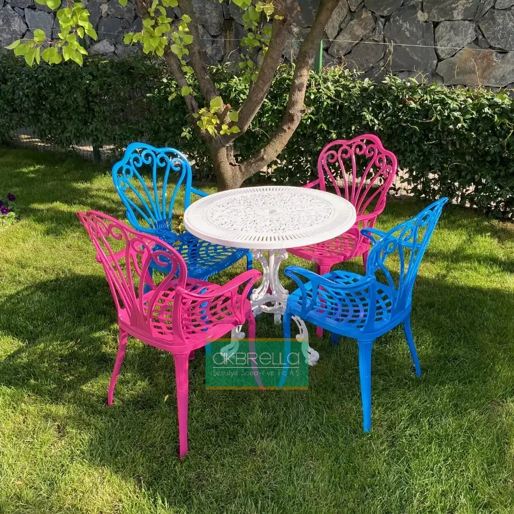 PG Color Casting TK 1 ensemble de balcon en fonte d'aluminium pour 4 personnes se compose de 2 chaises en fonte d'aluminium modèle Paon rose, 2 bleu turquoise avec accoudoirs et table ronde en fonte d'aluminium blanche de 75 cm de diamètre. Il est enveloppé dans des galettes à bulles d'air et livré en colis.