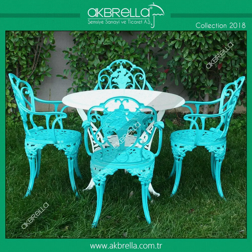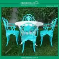 PG 04TK C4 modèle 4 chaise de jardin à bras en fonte d'aluminium bleu turquoise avec motif rose et table ronde en fonte d'aluminium blanche de 90 cm de diamètre avec ensemble de balcon à motif rose sont colorés avec une peinture de cuisson électrostatique résistante aux conditions météorologiques extérieures et à l'eau. Les coussins sur les chaises et le verre trempé et rodé sur la table peuvent être préférés.