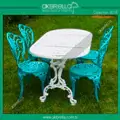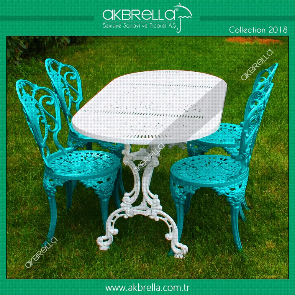 L'ensemble de jardin en aluminium moulé sous pression modèle PG 7545TK C4 pour 4 personnes peut être combiné avec 4 chaises de jardin sans accoudoirs en aluminium moulé sous pression bleu turquoise avec motifs roses et 1 table de moulage sous pression en aluminium à motif de dentelle blanche ellipse de 75x150 cm et produite en différentes couleurs sur commande. Vous pouvez ajouter une touche plus moderne à la table en achetant des baguettes rondes transparentes ou fumées et du verre trempé sur la table.