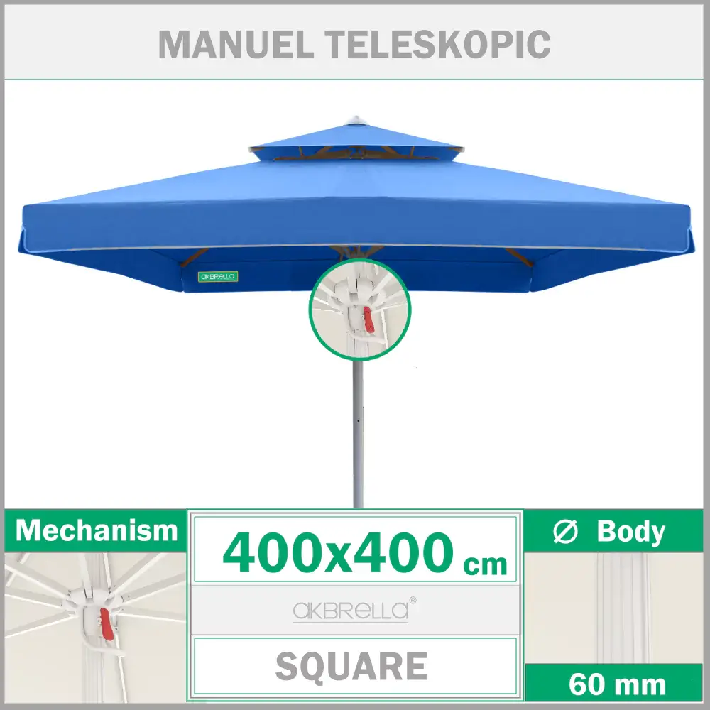 Gli ombrelli telescopici manuali quadrati 400x400 cm, che possiamo produrre in serie in qualsiasi numero e dimensione in base alle dimensioni del tuo spazio esterno e che puoi utilizzare nelle tue catene di ristoranti bar, esibiscono una postura duratura in aree esterne ventose grazie al loro corpo spesso 60 mm. Puoi contattare la nostra linea WhatsApp per informazioni più dettagliate sui nostri ombrelloni da terrazza e piscina con corpo in alluminio con rivestimento anodizzato argento, tessuto acrilico e per le tue domande.