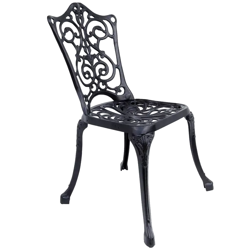 PG 7225 model La sedia da giardino senza braccia in alluminio nero con ricamo in pizzo vittoriano è stata prodotta per coloro che vogliono soffiare venti vintage nelle loro case, giardini, caffè e ristoranti. la sedia da giardino in fusione di alluminio al 100% può essere colorata in modo diverso in base alla domanda, l'invecchiamento può essere applicato sulla vernice. 54X90X56CM-7.5KG
