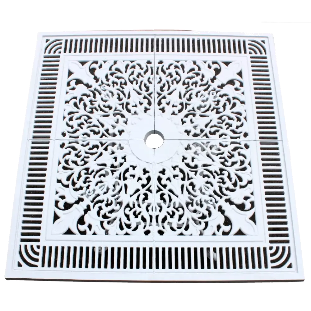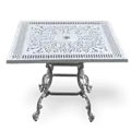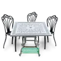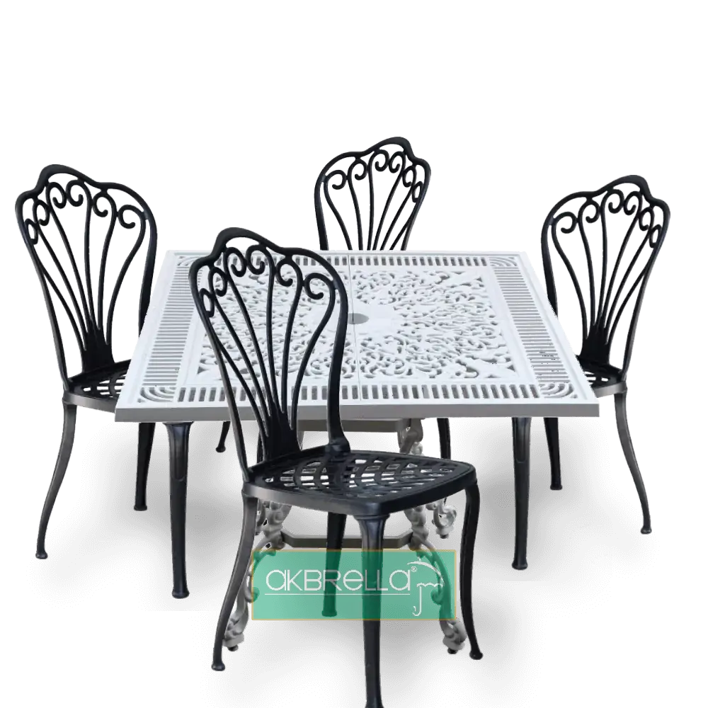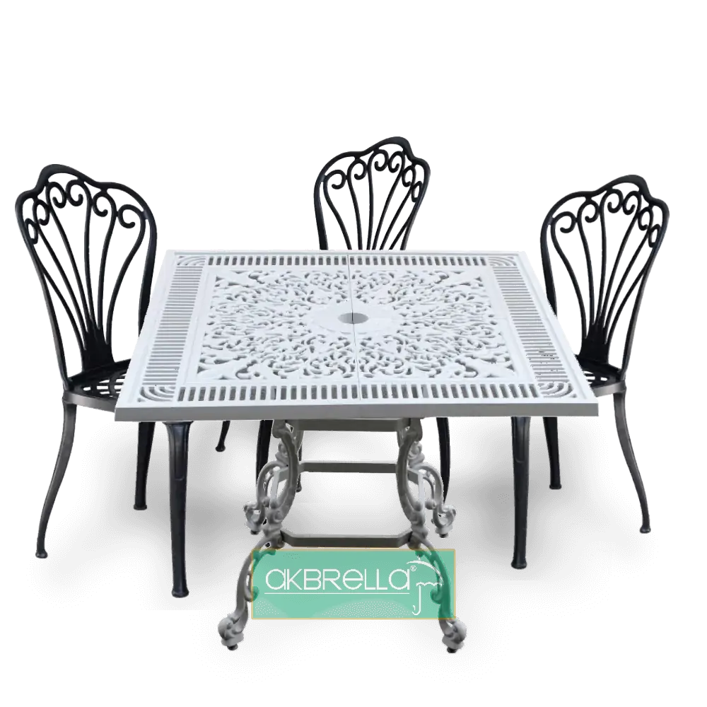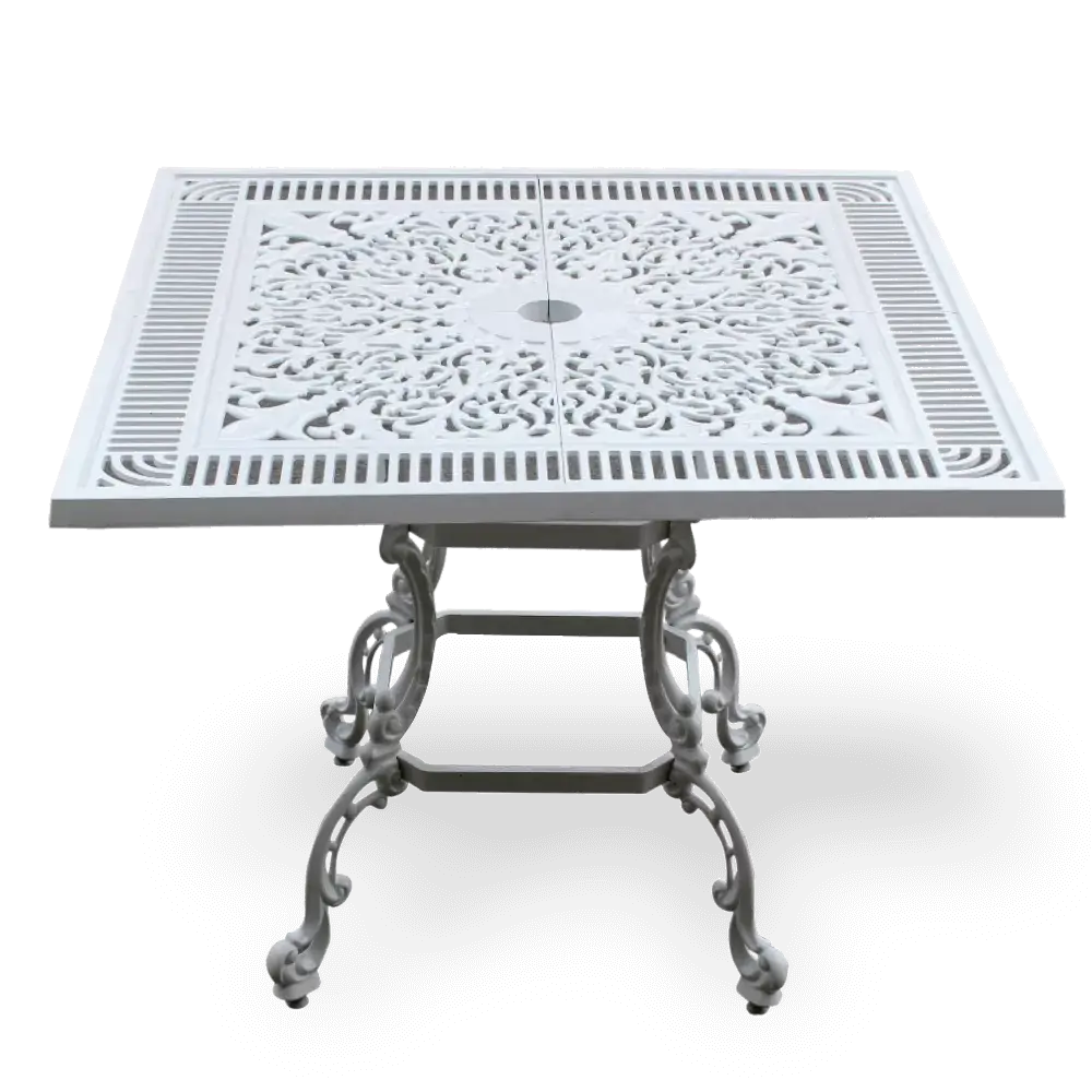 Pressofusione decorativa in alluminio 100x100 cm con motivi in pizzo, il tavolo quadrato bianco a 4 gambe è disponibile anche nei formati 90x90 cm, 75x75cm e 70x70 cm. È possibile creare un set da giardino insieme a sedie da giardino in fusione di alluminio con motivi di pavone o motivi di rosa nello stesso colore o colori diversi. Il vetro temperato e rodaged può essere preferito sul tavolo. 100x2x100cm 21kg