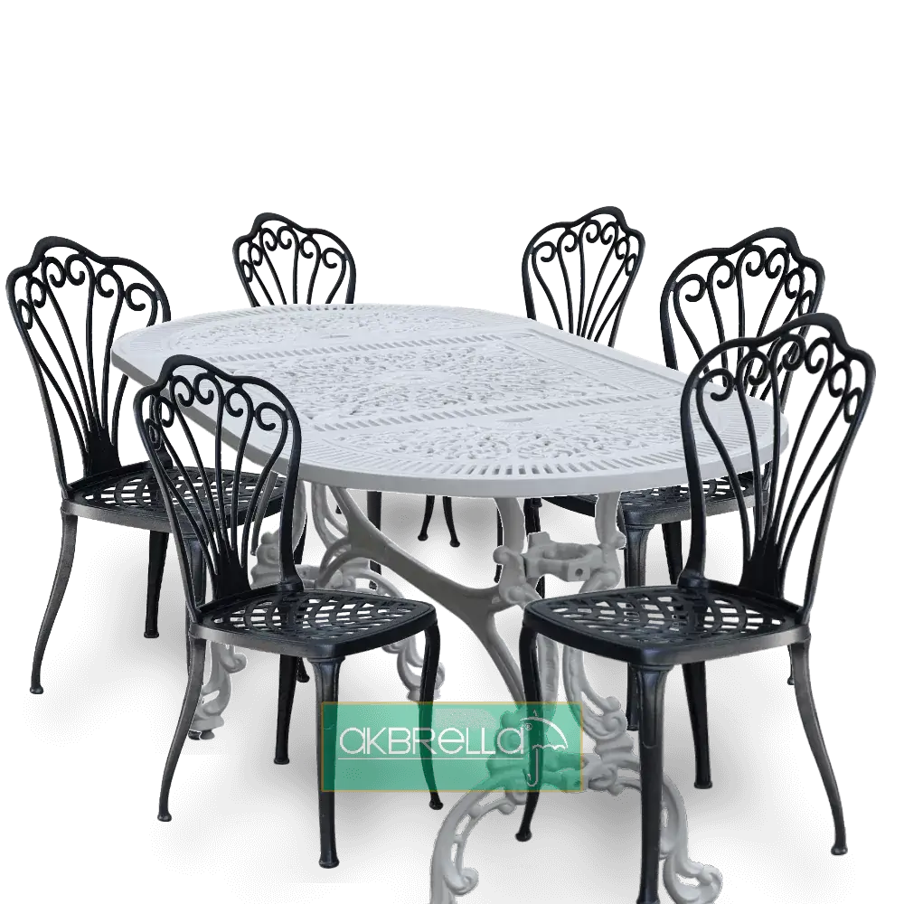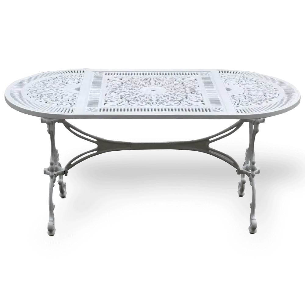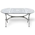 Masa albă turnată sub presiune din aluminiu elipsă de 75x150 cm cu motive din dantelă poate fi achiziționată ca un singur etaj dacă doriți, puteți alege dintre seturile noastre de balcon pe care vi le-am pregătit.