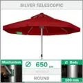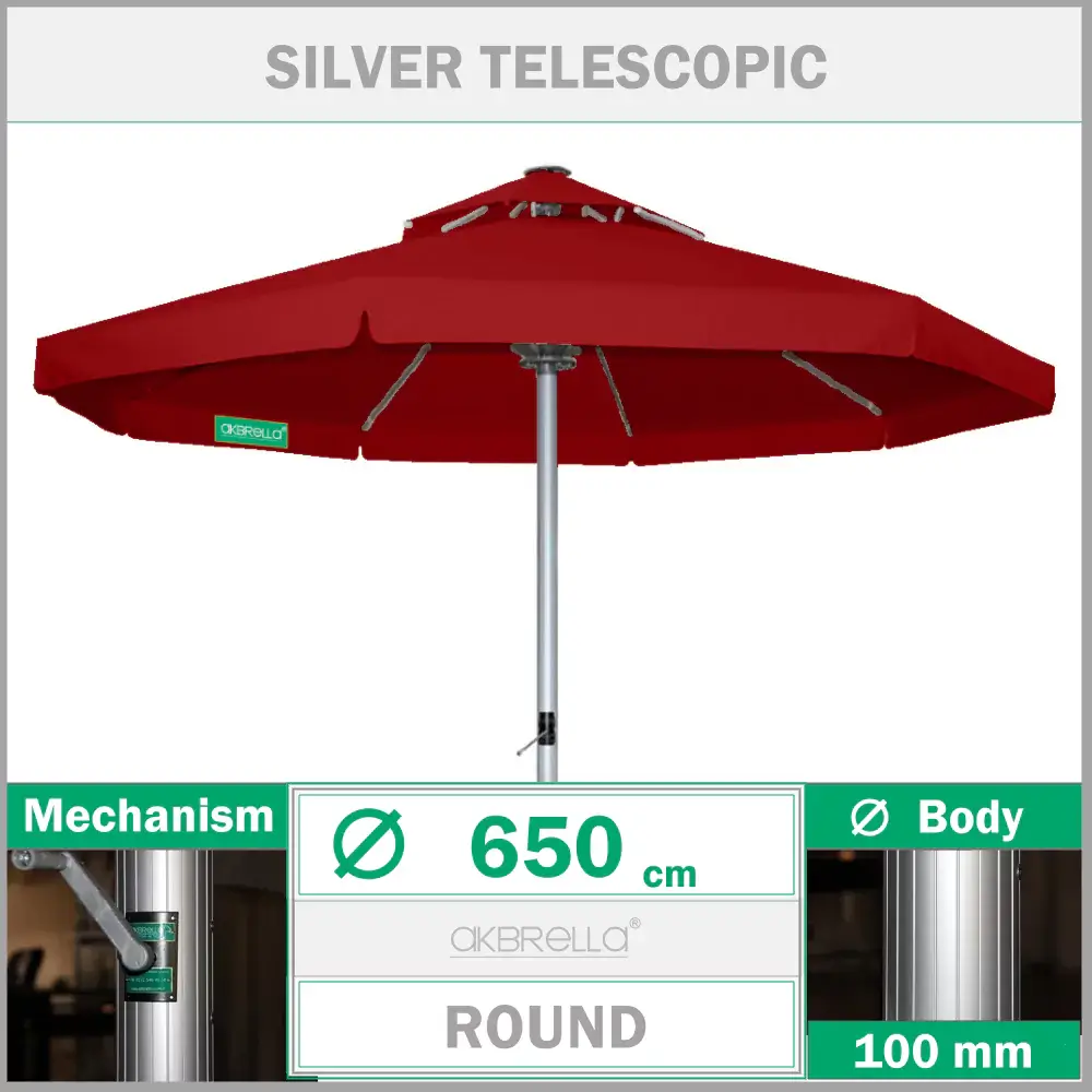 Садовый зонт для кафе с телескопической системой, изготовленный из акриловой ткани, с корпусом из серебристого алюминия толщиной 100 мм и диаметром 650 см, с вентиляционным дымоходом, с бахромой или без нее, может быть предпочтительным. Наши садовые зонтики, которые обеспечивают превосходное затенение на открытом воздухе на летнем солнце, могут быть предпочтительнее ножек, утяжеленных мрамором на колесиках, или ножек с фиксированными дюбелями на бетоне.