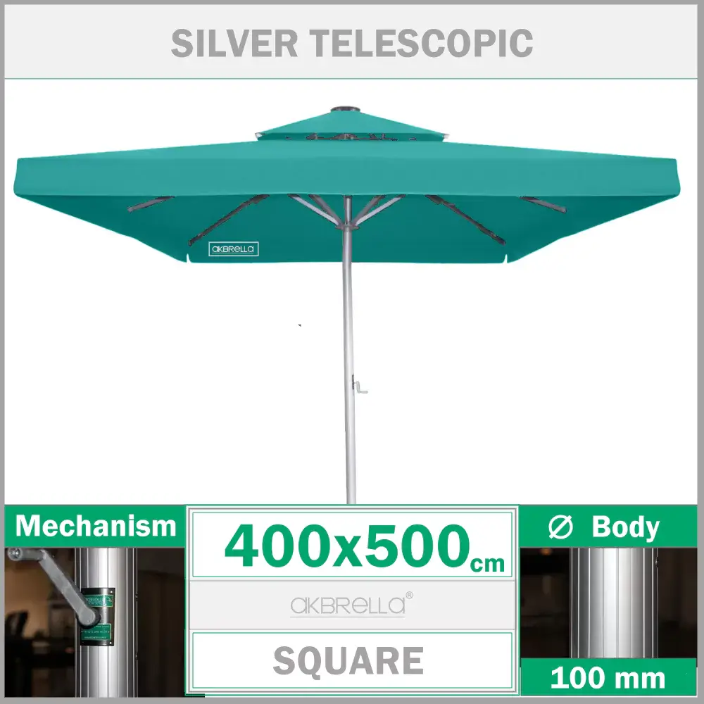 Dinlendirici ve huzur veren maviyle yeşilin karışımı turkuaz renk 400x500 cm kare 100mm kalınlıkta Silver alüminyum gövdeli, akrilik kumaşlı teleskopik cafe, restoran bahçe şemsiyesi dış mekanlarınıza eşsiz bir tasarım sunar. Otellerin, cafe ve restoranların en çok tercih ettiği dayanıklı, güneş ve rüzgar koruması sağlayan bahçe şemsiyeleridir.Firmanızın logo baskısı uygulanabilmektedir. 2 yıl kullanım garantisi olan Akbrella markalı şemsiyelerimizin 320 g/m² akrilik kumaşları İspanya'dan ithal olup 10 yıla varan renk solmazlık ve küflenmeme garantilidir.