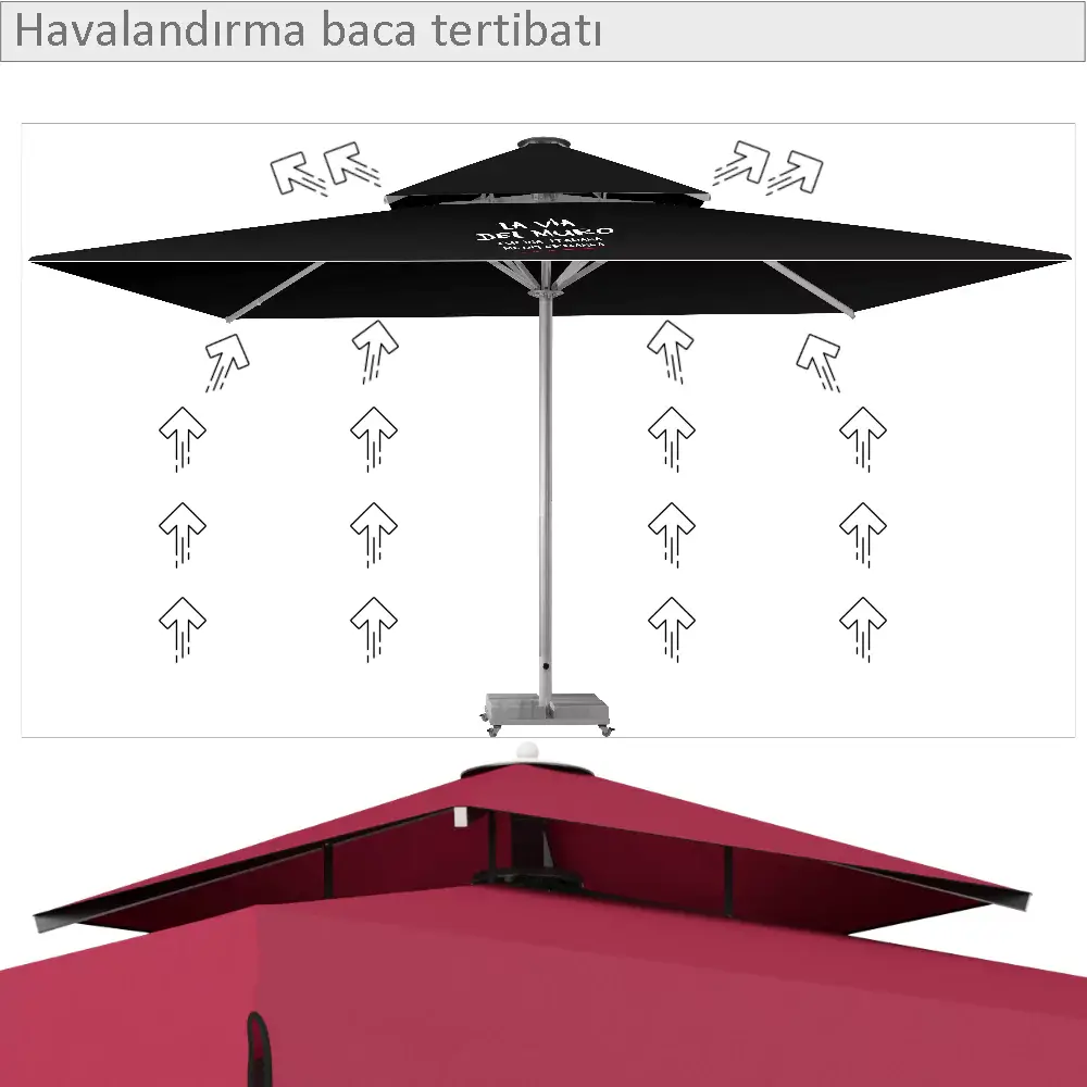 250 cm çap yuvarlak 7x7cm gövde kalınlıklı, saçaklı model alüminyum yandan gövdeli bahçe şemsiyesi makaralı sistem yardımıyla kolayca açılıp kapanabilmektedir. Farklı ölçülerde yuvarlak ve kare olarak akrilik ve polyester kumaştan üretilebilmektedir.