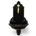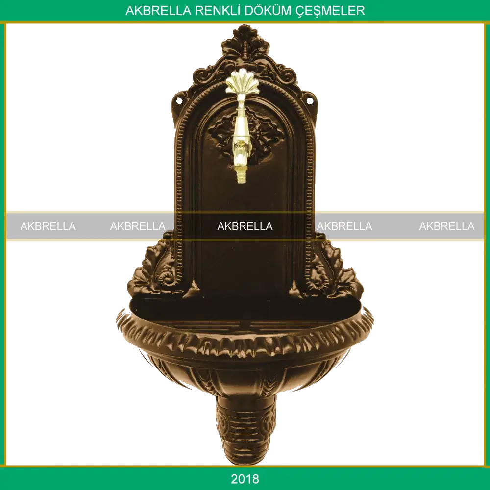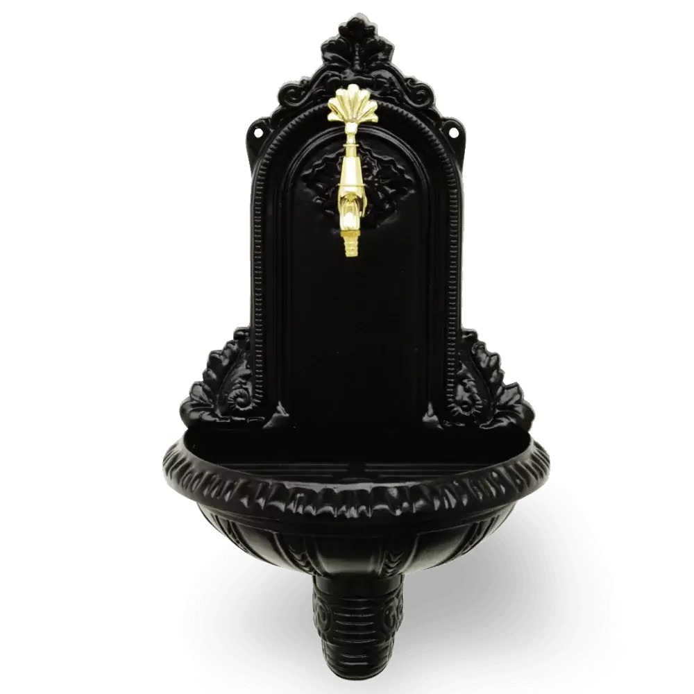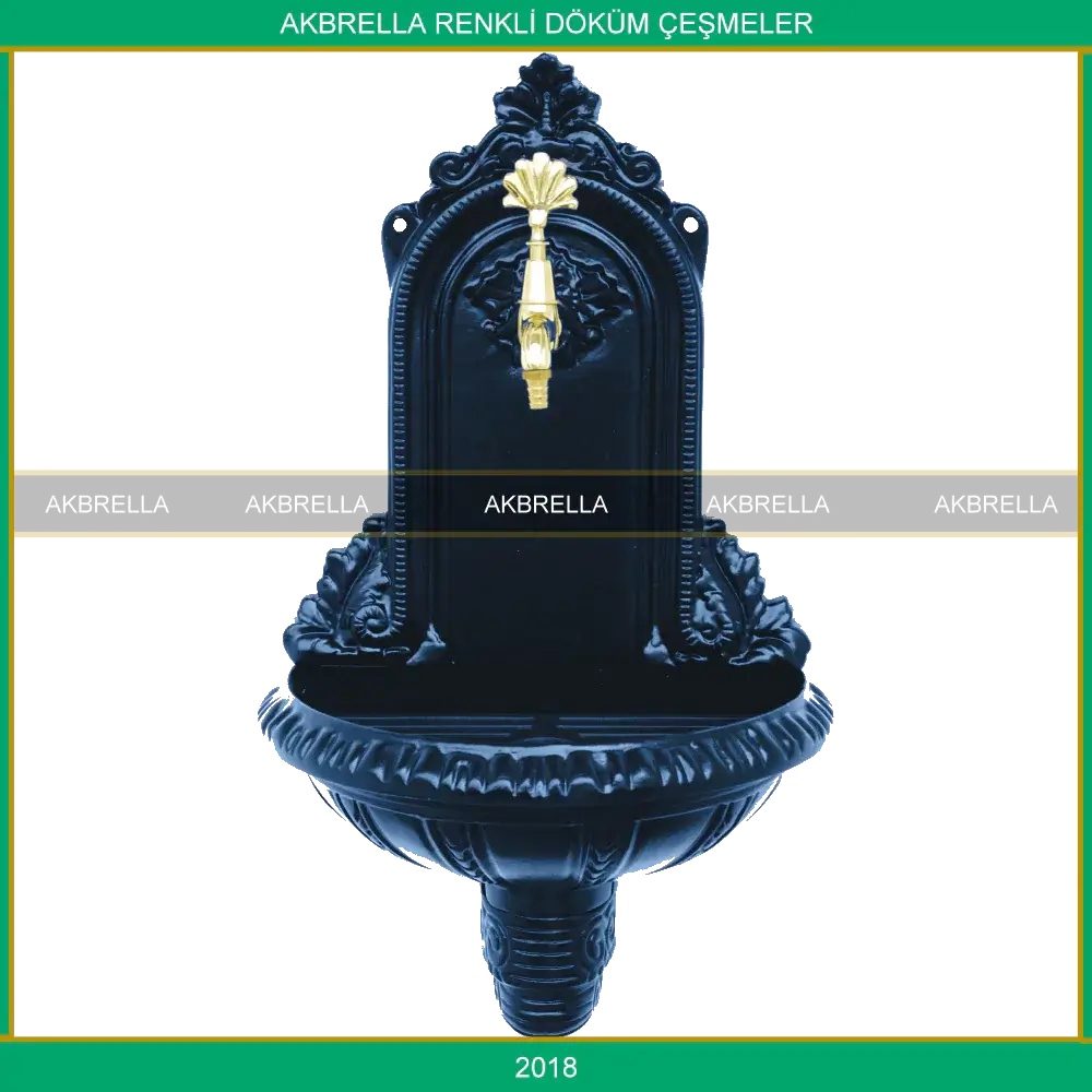 Osmanlı tipi siyah alüminyum döküm duvar tipi bahçe çeşmesi, sarı pirinç musluğuyla, lavabo haznesiyle villa bahçelerinde, şehir meydanlarında, parklarda kullanılmak üzere dış mekana dayanıklı alüminyum dökümden üretilmiş olup solvent içermeyen elektrostatik boyayla renklendirilmiştir. Farklı renk seçenekleri olan bahçe çeşmesini toptan ya da perakende sipariş etmek için WhatsApp hattımızdan iletişim kurabilirsiniz. 250x770x450cm sondan yalağa kadar-260cm 7kg