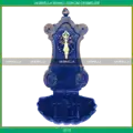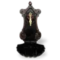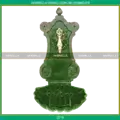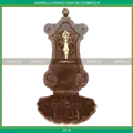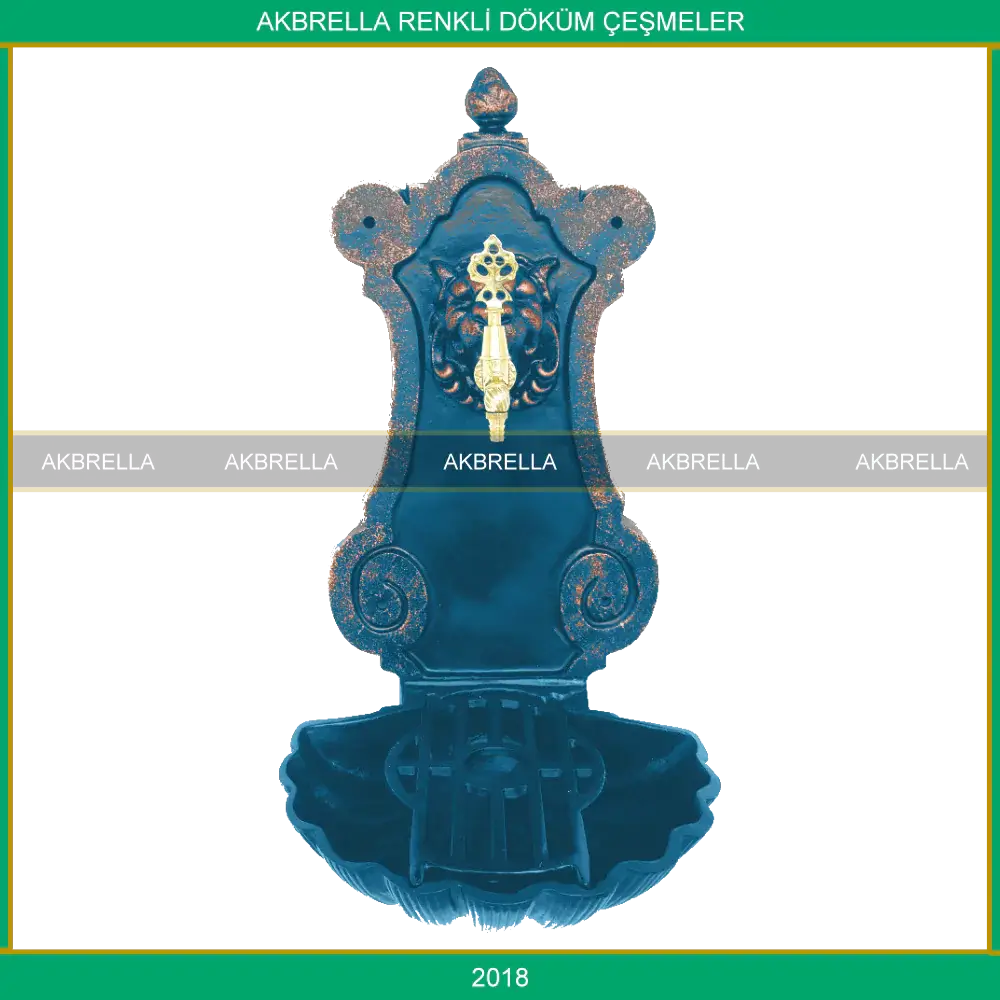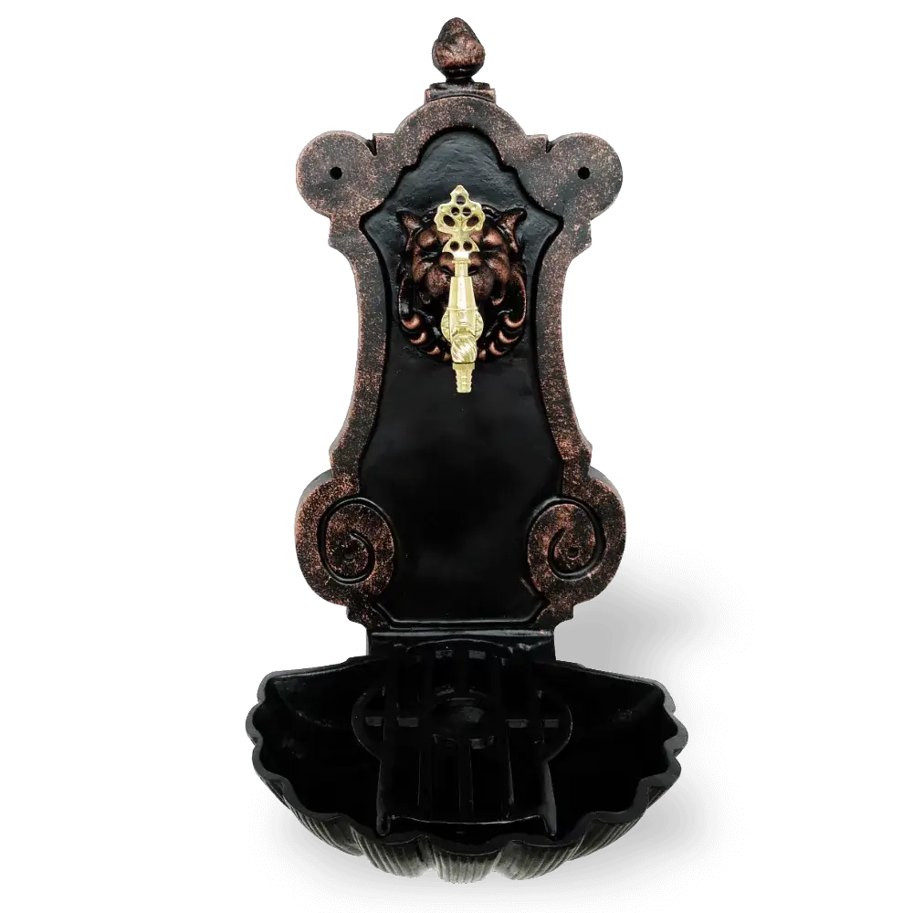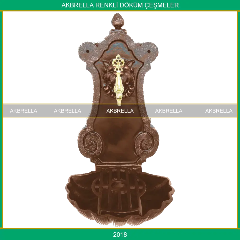İstridye lavabo hazneli, Aslan başı figürlü siyah üzerine bakır eskitme alüminyum döküm, sarı pirinç musluklu, duvar tipi bahçe çeşmesi yaz, kış bahçenizde kullanabileceğiniz antik dönemi yansıtan, dış mekana dayanıklı alüminyum dökümden üretilmiş elektrostatik fırın boyalı bir bahçe çeşmesidir. İç bağlantı tesisatıyla birlikte teslim edilmekte olan bahçe çeşmesinin 2 yıl kullanım garantisi vardır. Parklarda, bahçelerde, hamamlarda kullanım için suyun ferahlatıcı etkisini anımsatan dekoratif bahçe çeşmesi talebe göre farklı renklerde de üretilebimektedir. 370x900x425mm - 410mm 12.5kg+1
