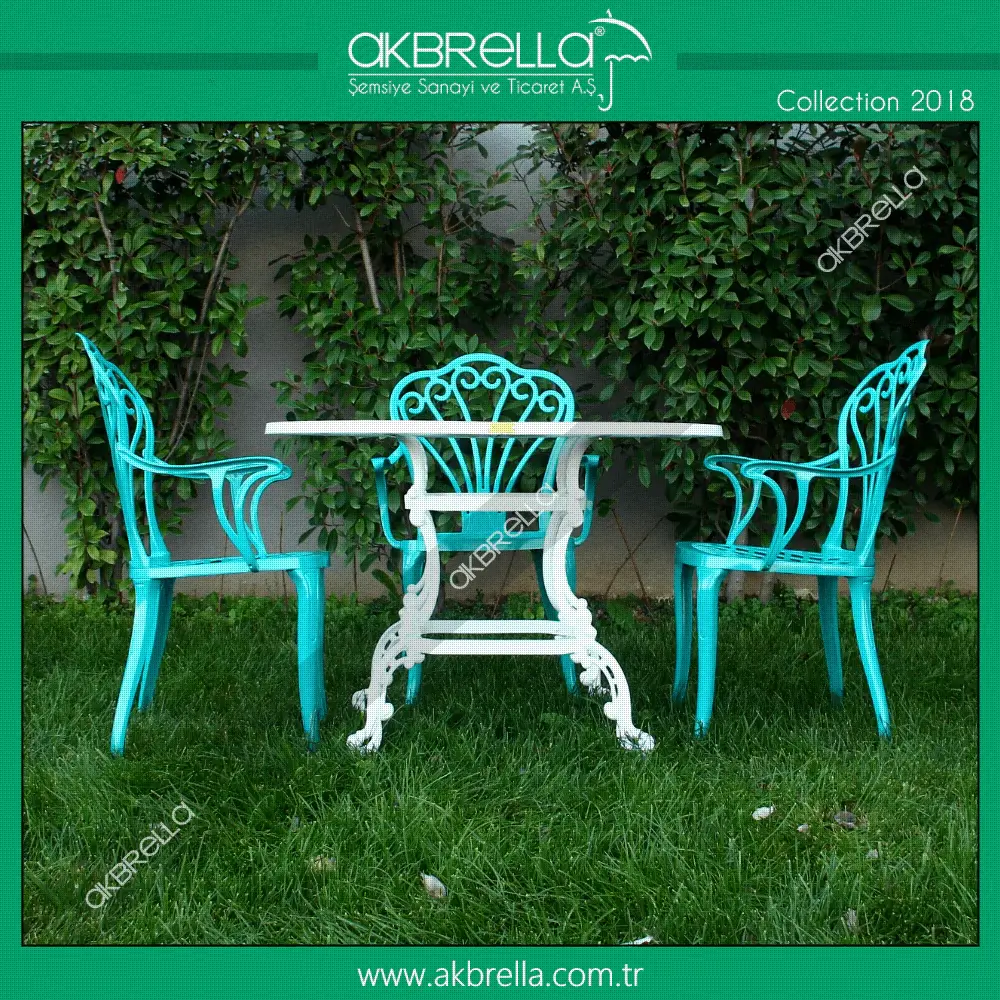 PG 7509TK A3 model 3 kişilik alüminyum döküm balkon takımı 3 adet Tavus Kuşu model turkuaz mavi alüminyum döküm kollu bahçe sandalyesi ve 1 adet 100x100 cm kare beyaz Dantel Motifli 4 ayaklı masadan oluşmaktadır. Bahçe sandalyeleri kollu olarak ve farklı renklerde tercih edilebilir. Ürünler sipariş üzerine 7 iş günü içinde teslim edilmektedir. 2 yıl kullanım garantisi olan döküm balkon setini satınalmak için Whatsapp hattımızdan müşteri temsilcilerimizle iletişim kurabilirsiniz.