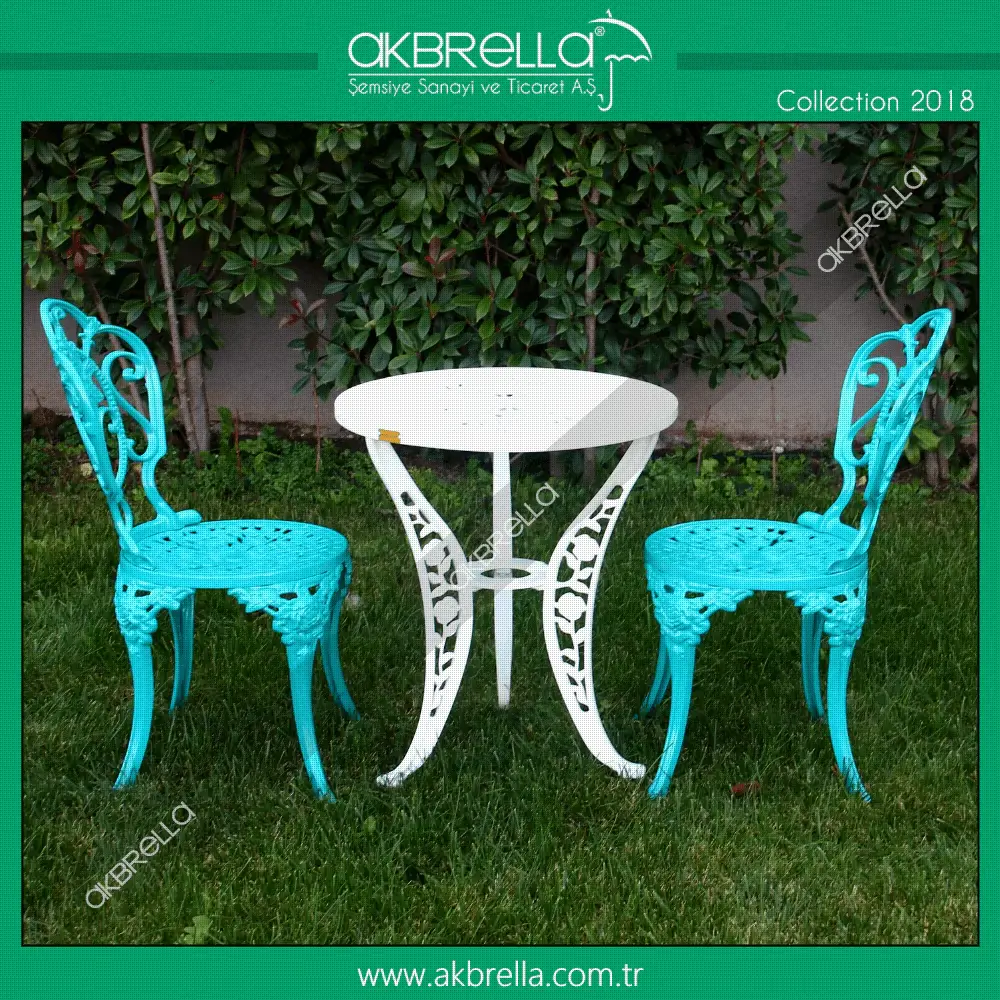 PG 7515TK C2 Vintage Victorian model 2 adet turkuaz mavi alüminyum döküm kolsuz bahçe sandalyesi ,63 cm çap yuvarlak beyaz alüminyum döküm masa balkon seti alüminyum dökümden üretilmiştir. Elektrostatik fırın boyalı bahçe mobilyası müşteri talebine göre farklı renklerde de üretilebilmektedir. 2 yıl kullanım garantisi olan döküm balkon setini satınalmak için Whatsapp hattımızdan müşteri temsilcilerimizle iletişim kurabilirsiniz.