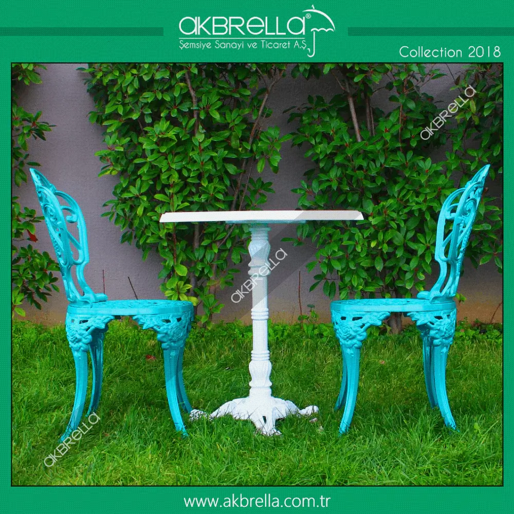 PG 7525TK C2 model 2 kişilik alüminyum döküm bahçe takımı 2 adet Gül Motifli turkuaz mavi alüminyum döküm kolsuz bahçe sandalyesi ve 1 adet 60x60 cm kare beyaz Antik Motifli alüminyum döküm masadan oluşmaktadır. Cafeleri tercih ettiği bahçe seti dış mekan hava koşullarına ve suya dayanıklı olduğundan villanızın bahçesinde de dört mevsim kullanabileceğiniz bir üründür.