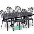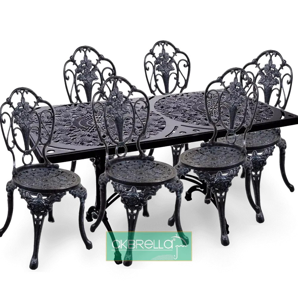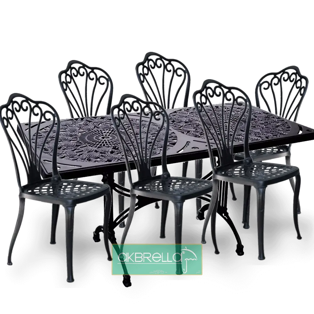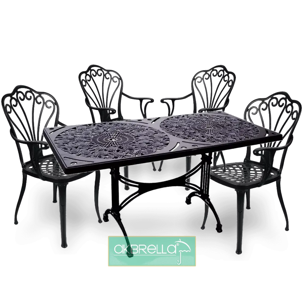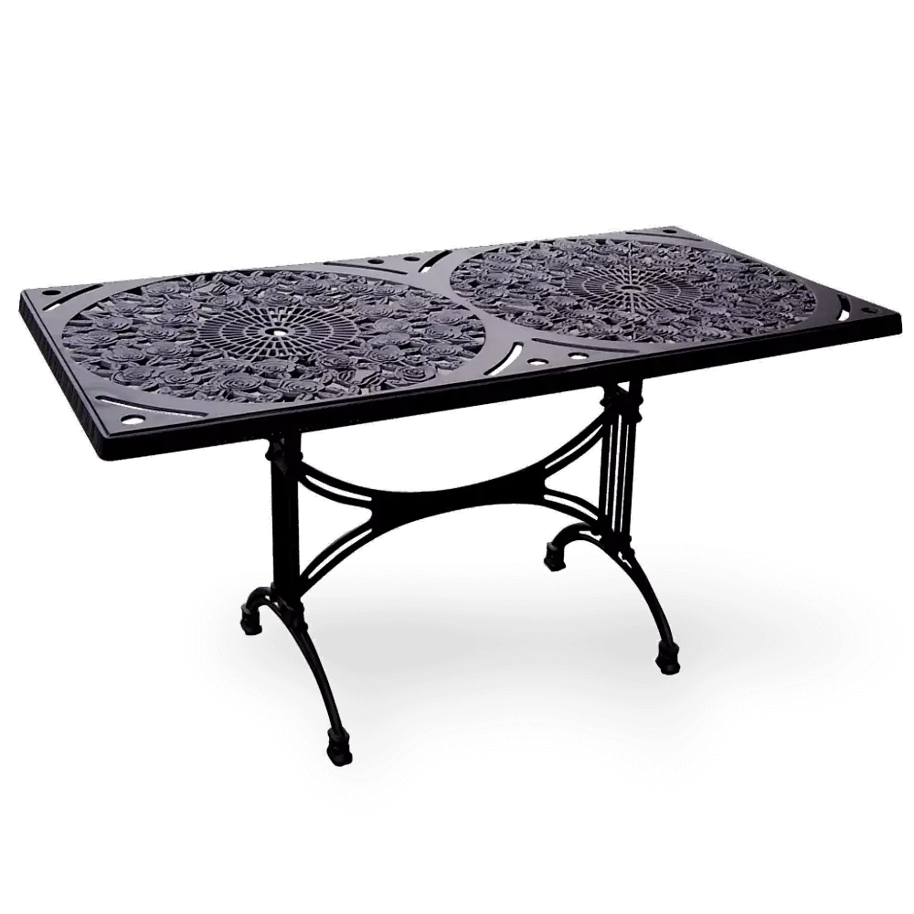 PG 7530 model 80x160 cm Gül desenli dikdörtgen nostaljik siyah alüminyum döküm masayla bahçeleriniz, balkonlarınız şenlenecek. Gül desenli alüminyum döküm bahçe sandalyeleri ve üzerlerine renkli minderler tercih ederek bahçenizde güller açtırabilirsiniz. 160x73x80cm 26kg