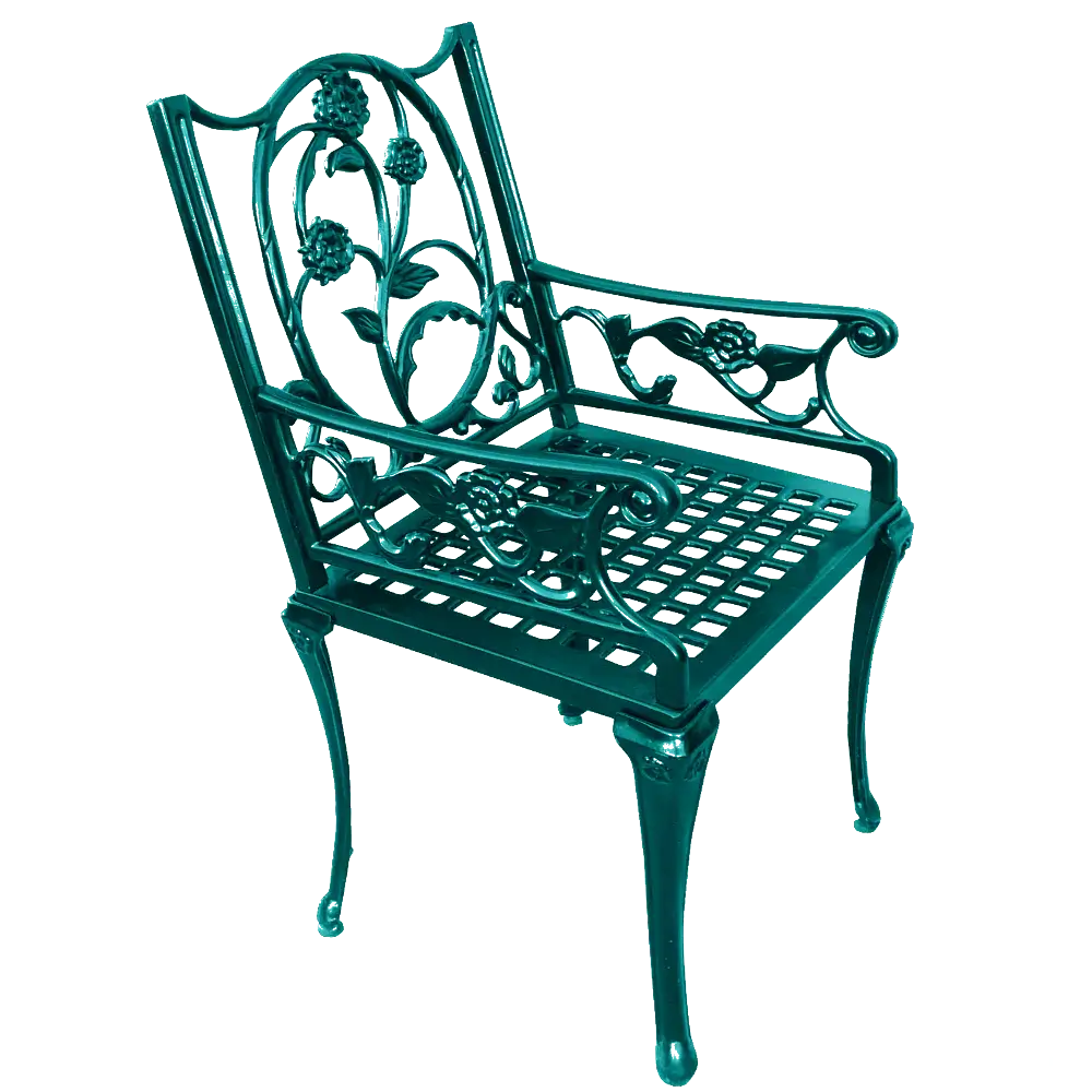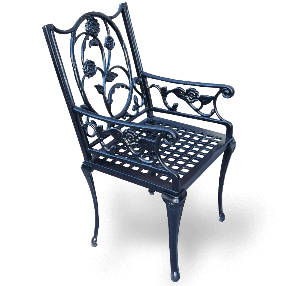 PG 7275 model Sarmaşık Çiçek İşlemeli Neoklasik siyah alüminyum döküm kollu bahçe sandalyesi tüm dış mekanlarda rüzgardan savrulmadan yaz kış durabilecek uzun ömürlü ve dayanıklı bir malzeme olan alüminyum dökümden üretilmiştir. 94X47X49CM-12KG