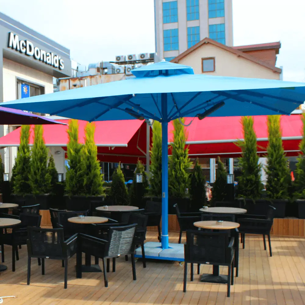 Siz kafe bog'i soyabonining matosini 550 sm dumaloq 100mm qalinlikdagi kumush alyuminiy korpusli akril matodan tayyorlangan teleskopik tizim bilan tanlashingiz mumkin, bu sizning makoningizga mos keladigan har qanday rangda 2 yillik foydalanish kafolatiga ega va siz tanani xohlagan rangda bo'yashingiz mumkin. Akbrella sizning tashqi makonlaringiz uchun mos echimlarni ishlab chiqaradi. Rang va o'lcham variantlari, oktyabr uskunalari haqida ma'lumot olish uchun biz bilan bog'lanishingiz mumkin.