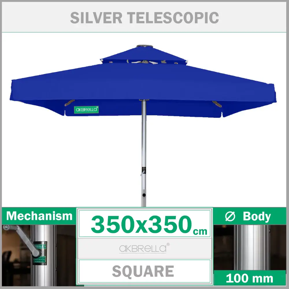 Moviy rangli 350x350 sm kvadrat 100 mm qalinlikdagi kumush 100% anodlangan alyuminiy korpus, teleskopik tizimdan tayyorlangan akril mato kafe soyaboni siz kafe, restoran, mehmonxona bog'lari, hovuz qirralari, villa bog'lari, teraslarni soya qilishni xohlaysiz. Agar xohlasangiz, qish oylari uchun bog ' soyaboniga isitgich qo'shib, soyabonlarning perimetrini shaffof PVX havo pardalari bilan yopib, kafe va restoranlaringizni qishki bog'larga aylantirishingiz mumkin. Marmar vaznli oyoqlar erga o'rnatilishi mumkin bo'lgan oyoq yoki oyoq sifatida kafe va restoranlarning eng afzal ko'rgan oyoq variantlari hisoblanadi.