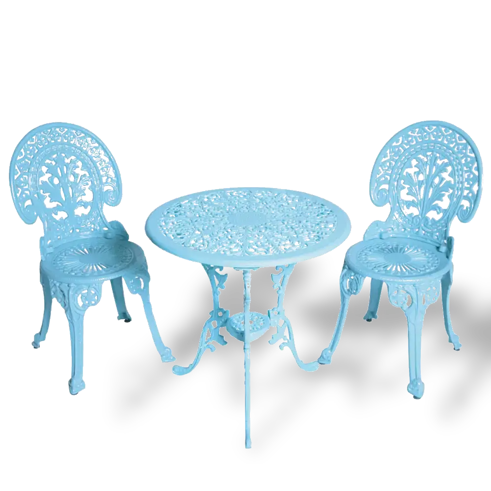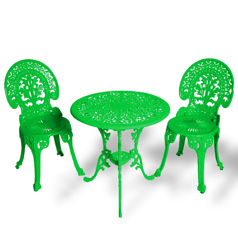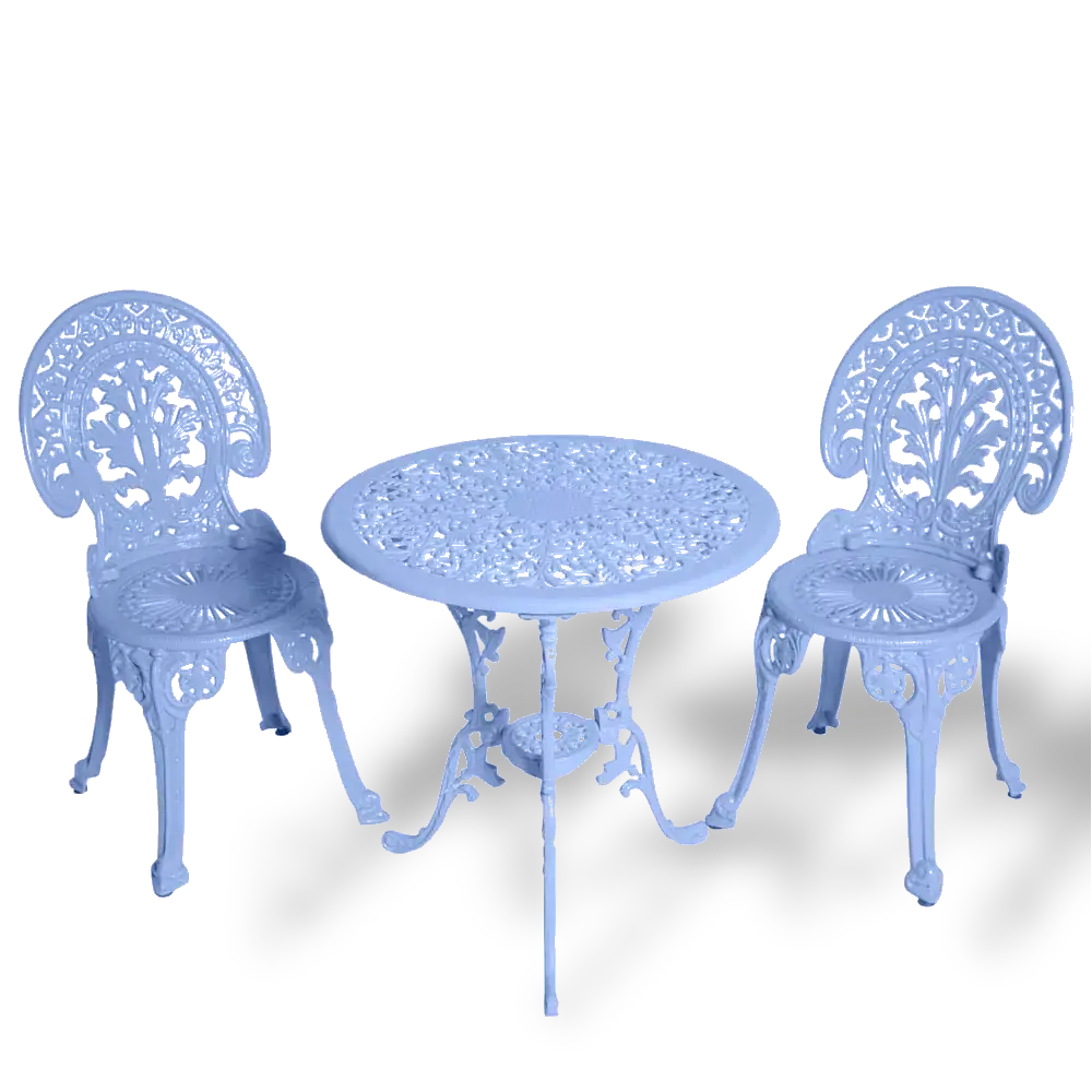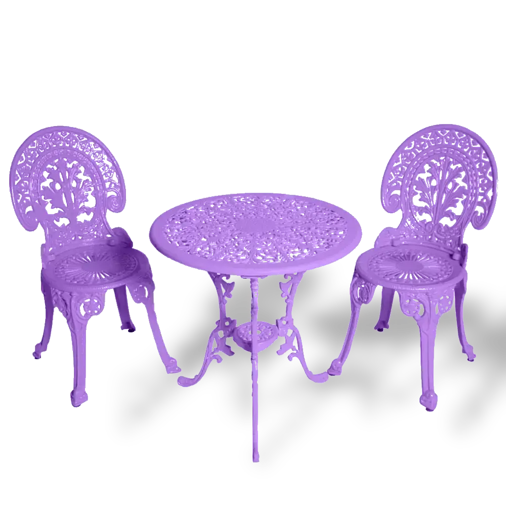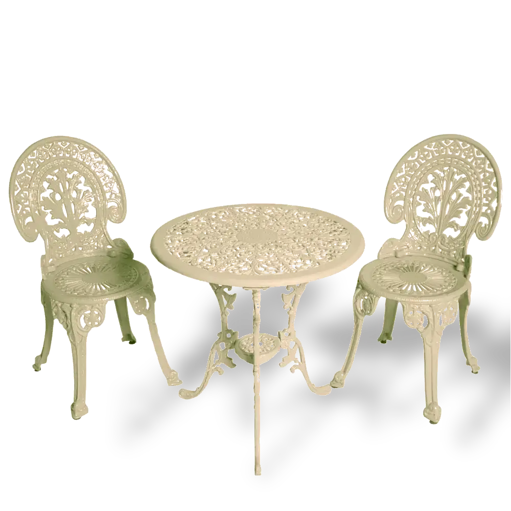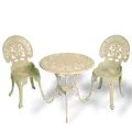 KSG TK - 16 Vintage Viktoriya modeli tomonidan siz 2 ta mot oq alyuminiy quyma qo'lsiz bog ' stullari va 64 sm diametrli dumaloq alyuminiy quyma stoldan foydalanishingiz mumkin, agar xohlasangiz yoki bog'ingizda balkonda o'rnatilgan. Turli xil ranglarda jilolanishi mumkin, chunki mat va porloq stullar va stollar bardoshli elektrostatik bo'yoq bilan bo'yalgan.