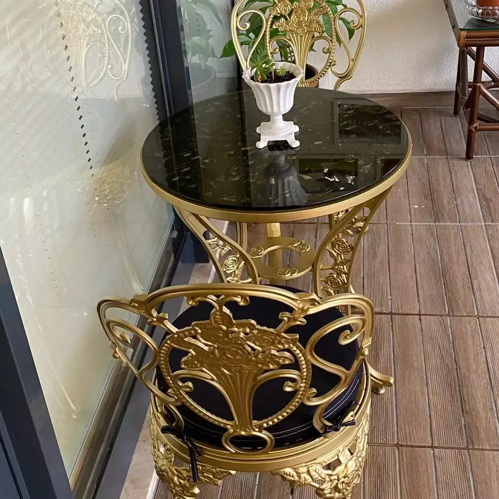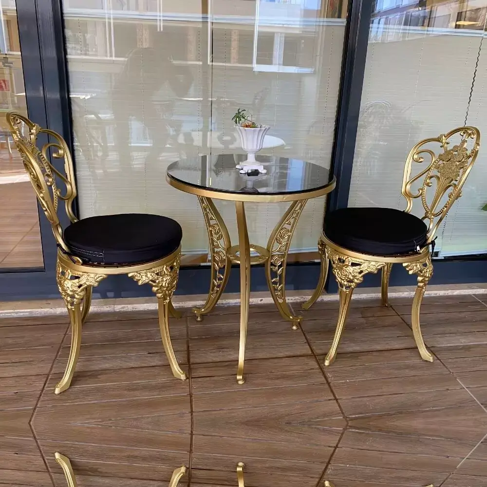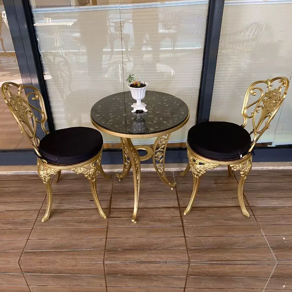 PG 61 sm diametrli dumaloq quyma alyuminiy stol va 2 ta Oltin quyma alyuminiy maysazor stullari, balkonlar, teraslar, bog'lar, oshxonalar, zallar, dekorativ va zamonaviy mahsulot sifatida ishlatilishi mumkin bo'lgan ichki va tashqi mebellarga ega yengsiz atirgulli oltin modellar. Ushbu ajoyib bog ' to'plami bilan balkoningizga va bog'ingizga nostaljik va zamonaviy muhit qo'shishingiz mumkin, bu erda stullar va stollardagi yostiqlardan ko'ra temperli va rodajli oynalarga ustunlik berish mumkin.