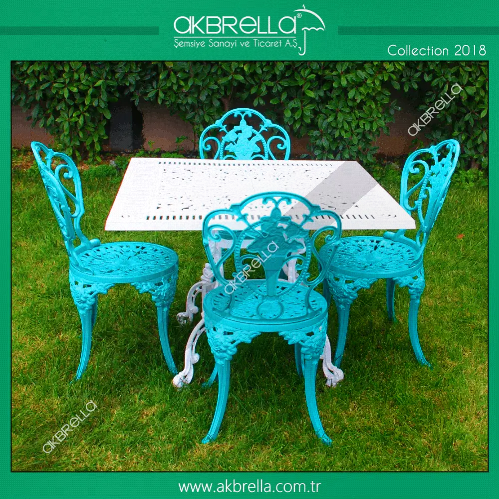 PG 7509TK C4 modeli 4 kishilik alyuminiy quyma bog 'to'plami 4 ta Turkuaz ko'k alyuminiy quyma qo'lsiz bog' stullari bilan birlashtirilgan atirgul motiflari va 1 100x100 sm kvadrat alyuminiy quyma stol oq Dantelli Motifli, bog ' to'plami buyurtma bo'yicha turli xil ranglarda ishlab chiqarilishi mumkin. Stolda shaffof yoki dudlangan dumaloq tayoqchali va temperli shisha sotib olib, stolga yanada zamonaviy tuyg'u qo'shishingiz mumkin.