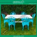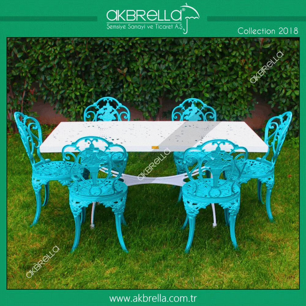 PG 05TK C6 model 6 kishilik alyuminiy quyma bog 'to'plami Atirgul naqshli 6 ta Turkuaz ko'k alyuminiy quyma qo'lsiz bog' stullari va 1 60x120 sm to'rtburchaklar oq alyuminiy quyma stolidan iborat. Shuningdek, siz o'zingiz uchun istalgan rang va o'lchamda ishlab chiqarishimiz mumkin bo'lgan yon tanali soyabon modellarimizni bog ' to'plamlari bilan birlashtira olasiz. O'z bog'larida o'zgarishlarni amalga oshirishni istaganlar uchun biz buyurtma asosida ishlab chiqaradigan bog ' to'plami havo pufakchali qoplarga o'ralgan va 7 ish kuni ichida posilkada etkazib beriladi.